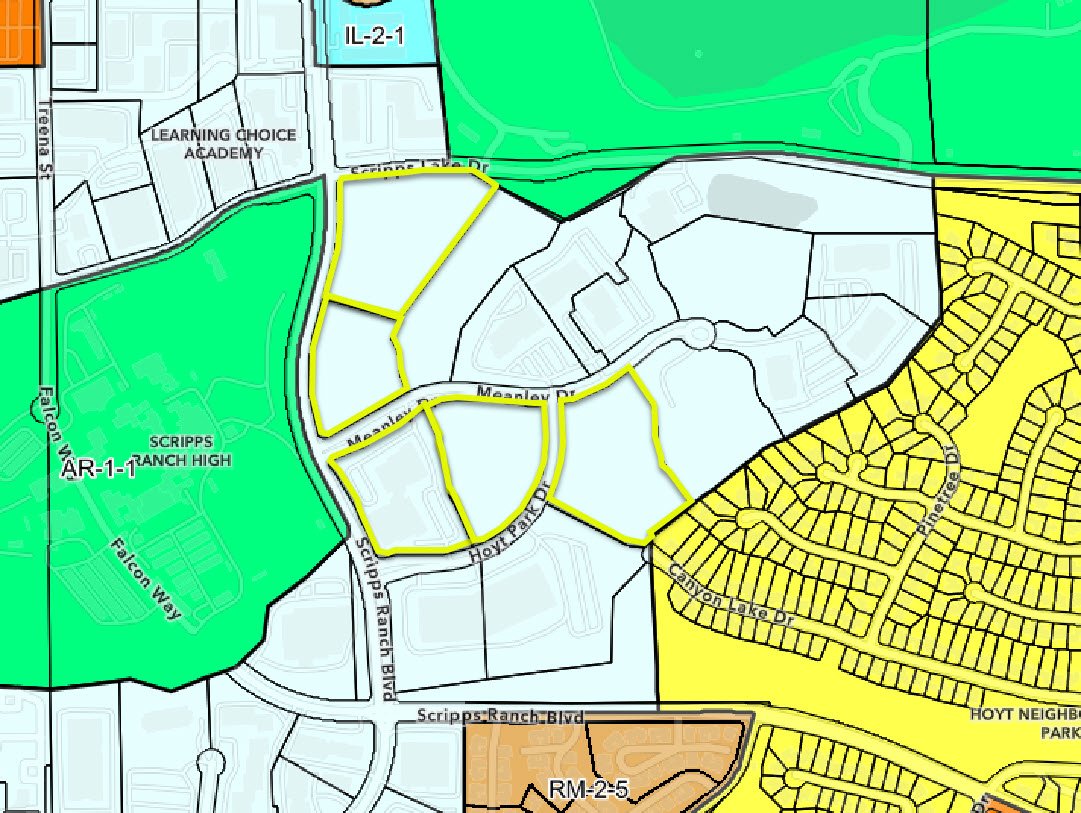 The project site is comprised of five parcels (lots 6, 9, 10, 11 and 12), totaling 23 acres. It is bordered by Scripps Ranch Blvd. and Scripps Lake Drive. Meanley Drive bisects lots 9 and 11.